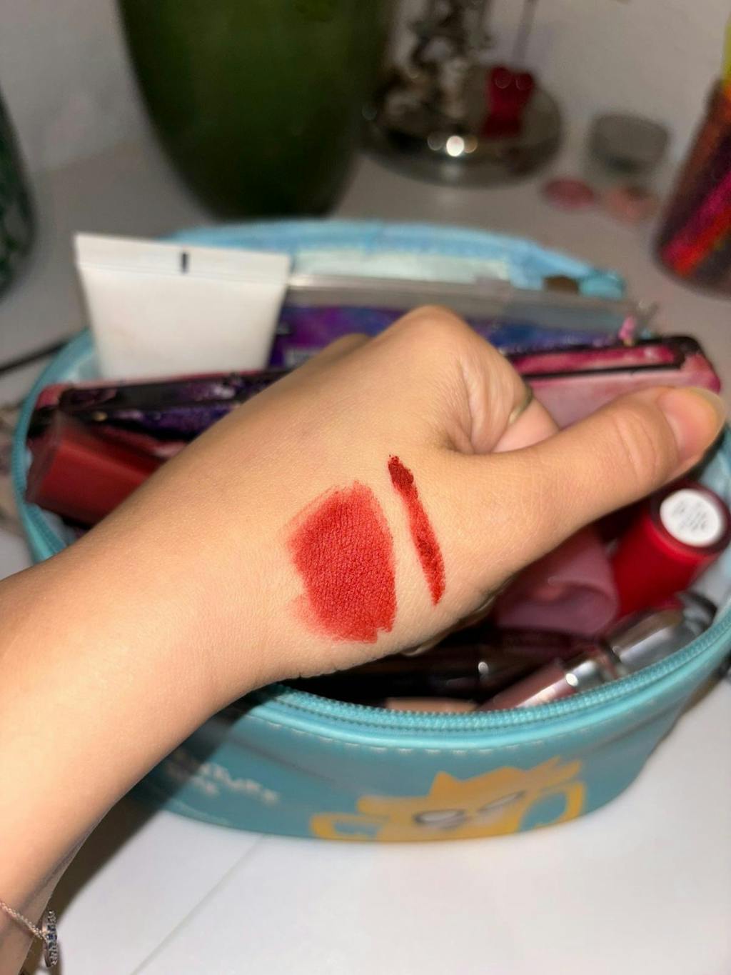 The main product's color is amazing and I LOVE IT! I had bought this product in previously and loved its smooth, soft, velvety formula—it gives the perfect 'vampire look.' I was so excited to buy it again here in Germany. However, the one I received this time is drier than I remember, which made me wonder if the formula had changed. My sister has this same product in a different color, and hers is noticeably smoother and not as dry. This difference makes me suspect that the unit I received is unusually dry or possibly used. I manage the dryness by applying a lip balm beforehand and letting it set, as matte colors emphasize dry lips.